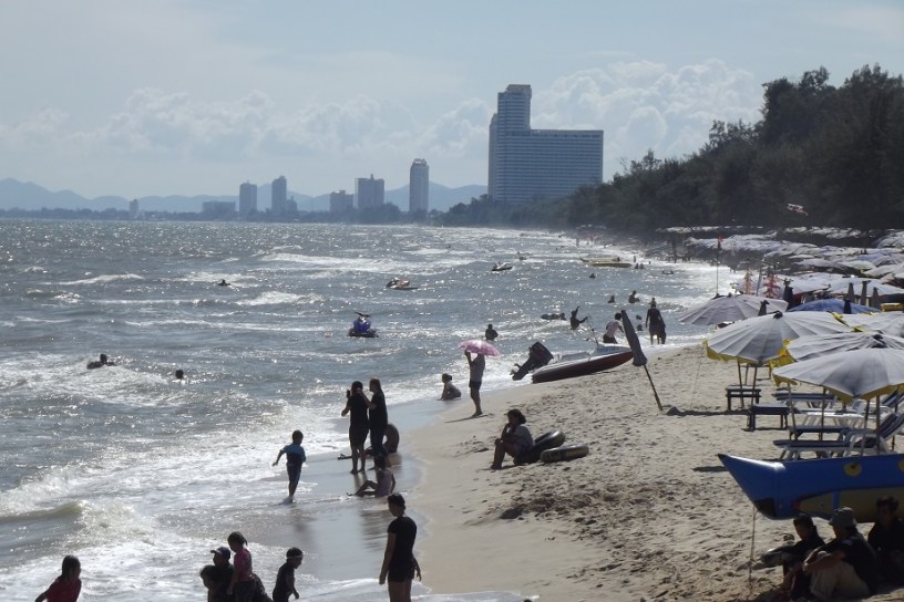 I later walked along the Ruamjit Road in anticipation of getting a feel of this beautiful seaside resort. Three seater bicycles were all parked up. One family of three cycled past. Shops were open selling inflatables and T-shirts. I purchased some flat lithium batteries for my cycle helmet lights and then headed back for breakfast.