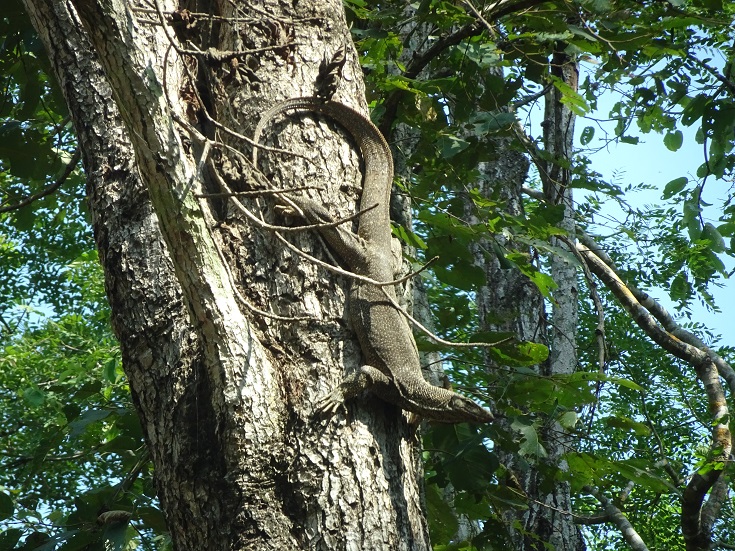 Although on the next day, we had a tour of the park, our guide was knowledgeable, but we didn’t see any tigers. We were told that the area we were in was home to around 80 tigers. Hopefully, that number will increase. We were also told that the area had snakes too, but again we didn’t see any. What we did see was a monitor lizard up a tree, no doubt after bird eggs.