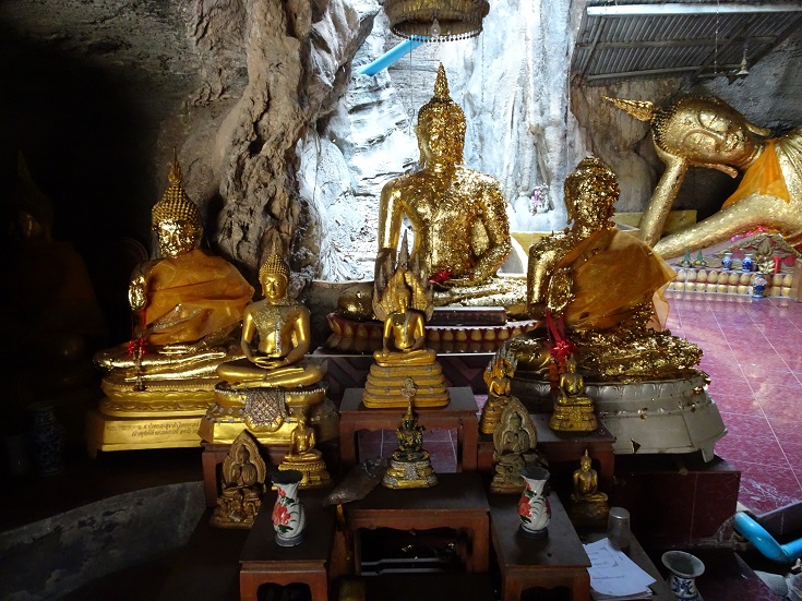 There, as I had expected a small shrine in which to worship Buddha. Golden Buddhas were there, including a reclining golden one. Remarkably, the cave floor had been tiled with electric points and lights fitted. Again, this didn’t seem t fit in with a place that dated back to the Dvaravati Period.