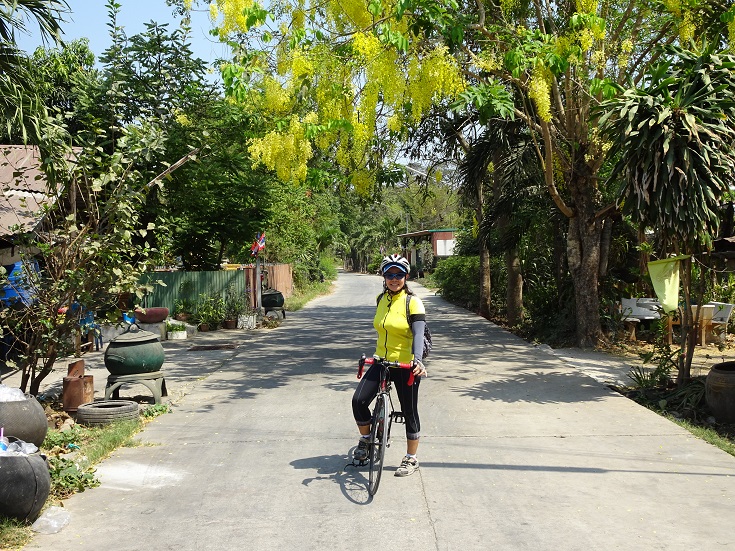 The local Ratchpreuk, Cassia fistula linn, was in full bloom, this shower of blossom certainly made Annie look good as she was wearing a similar coloured cycle jersey.