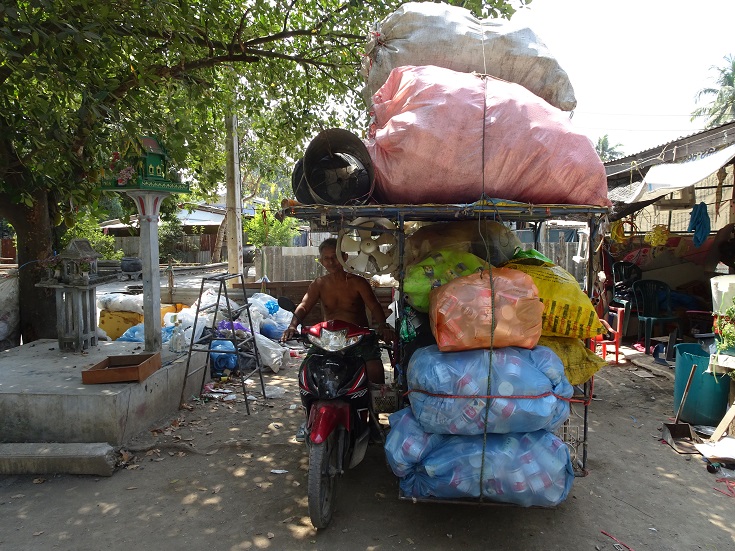 The roads were quiet and pleasant to cycle along. In one place, I spied a motorcyclist that was carrying far too many items for recycling. I stopped to take a photograph of him and his bike. He was more than happy for me to take his picture with his overloaded bike.